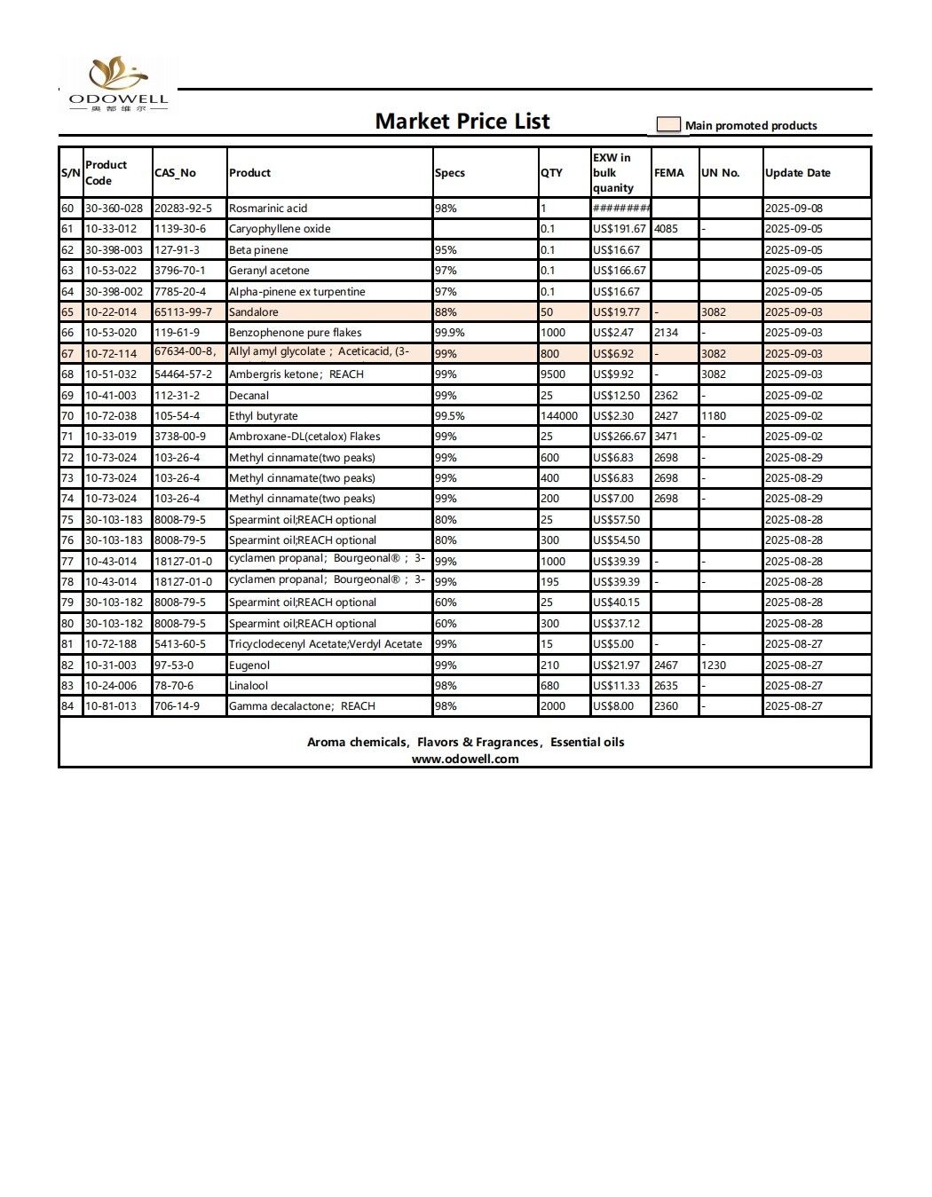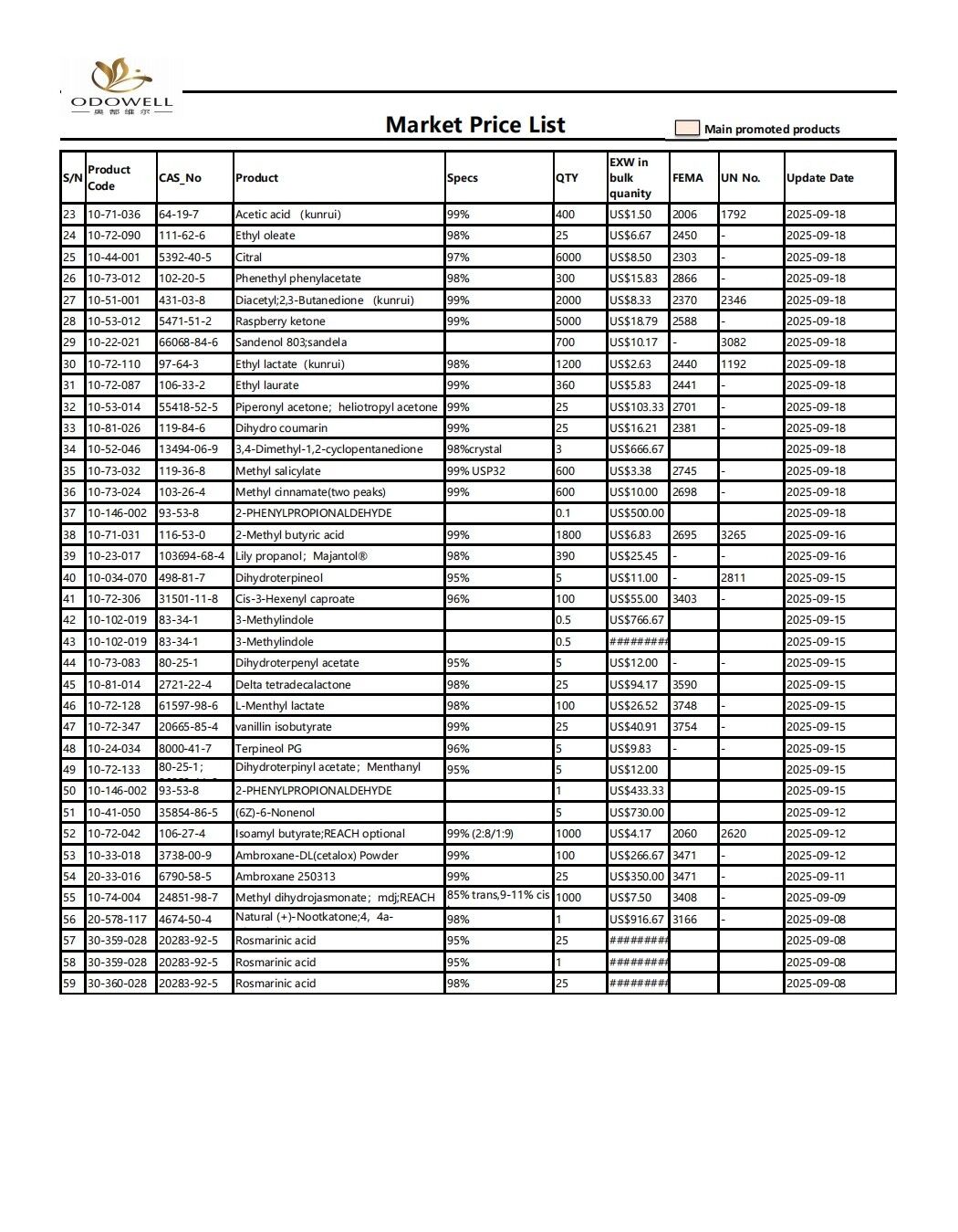 اوڈویل مارکیٹ قیمت کی فہرست -2025.8.27-2025.09.29